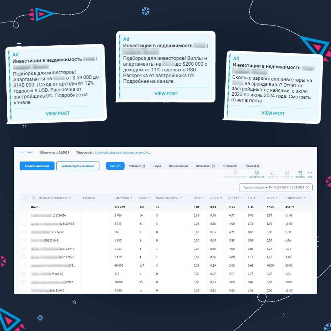 На старте тестировали рекламу в каналах конкурентов — недвижимость в Дубае и Турции